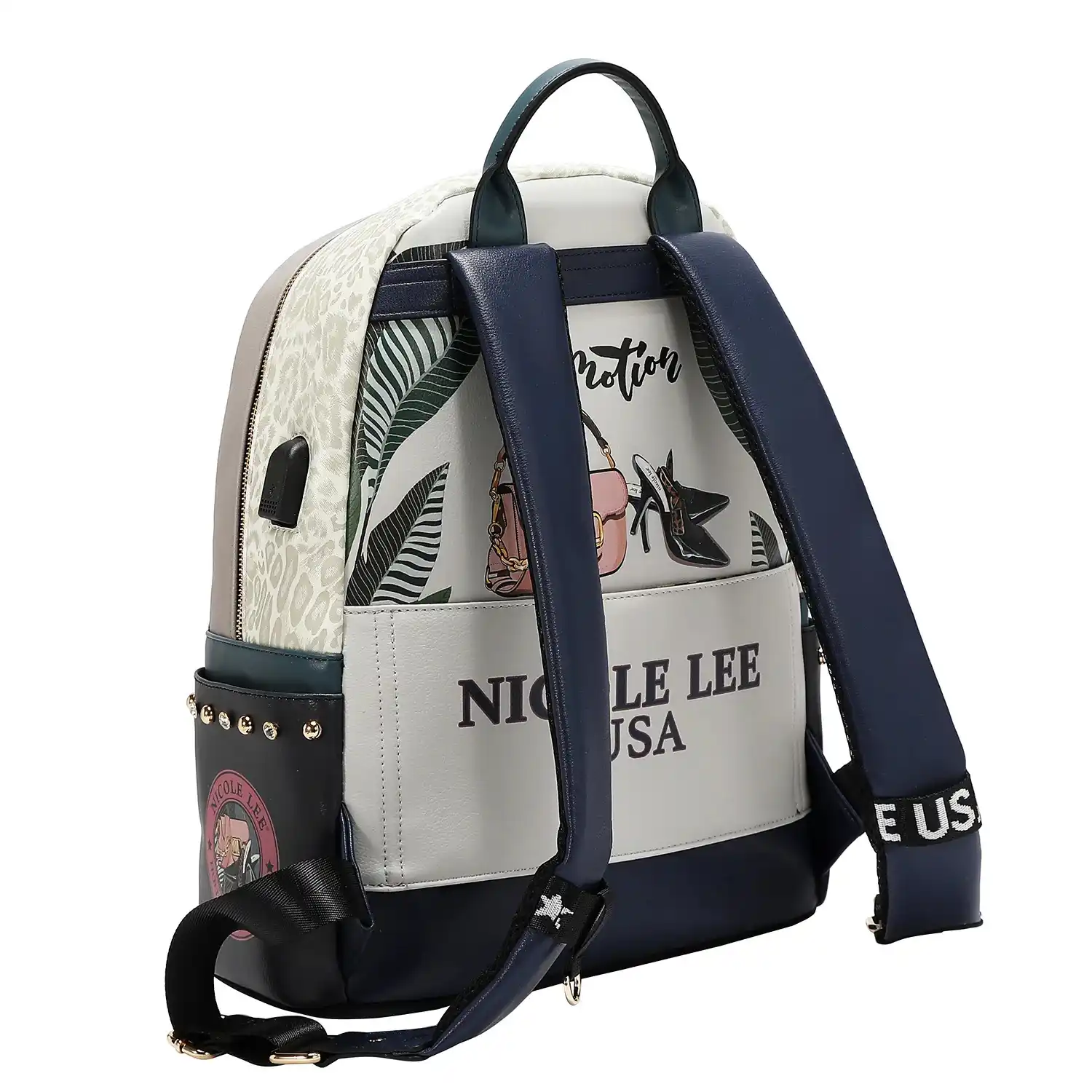 Pebbled vegan leather exterior Adjustable, dual shoulder straps (24"-31" length) with padding Structured, rolled top handle (1.5" drop) Wrap-around, two-way zip closure Front zip pouch trimmed with diamond rhinestone and studs Nicole Lee exclusive print design Logo engraved nameplate and zipper pulls Trolley sleeve with magnetic button closure and bottom zip closure to easily slide into luggage handles USB charging port Gold-tone hardware Premium print interior lining in polyester Interior 13" protective laptop compartment with velcro strap closure Interior back zip pocket with logo nameplate and key ring strap Interior front slip pockets for smartphone and wallet storage Includes interior, built-in USB cable that attaches to external USB port Size: 9"L x 4.5"W x 13"H To use, plug the interior cable to a portable charger (not included). Then, plug an external charging cable (not included) to the external USB port and your phone Please note, USB charging port is universally compatible with any smartphone. Portable charger and external charging cable are not included.