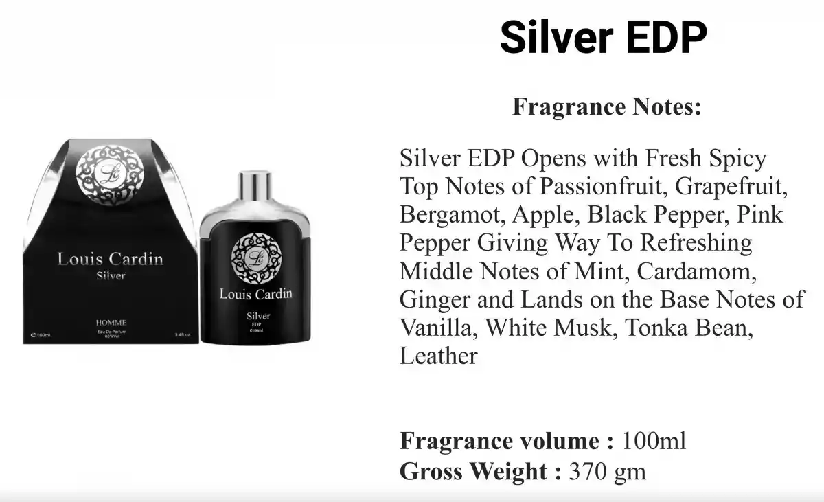 Silver EDP se abre con notas altas frescas y especiadas de maracuyá, pomelo, bergamota, manzana, pimienta negra, pimienta rosa dando paso a notas medias refrescantes de menta, cardamomo, jengibre y tierras en las notas base de vainilla, almizcle blanco, haba tonka, cuero. Silver EDP se abre con notas altas frescas y especiadas de maracuyá, pomelo, bergamota, manzana, pimienta negra, pimienta rosa dando paso a notas medias refrescantes de menta, cardamomo, jengibre y tierras en las notas base de vainilla, almizcle blanco, haba tonka, cuero.