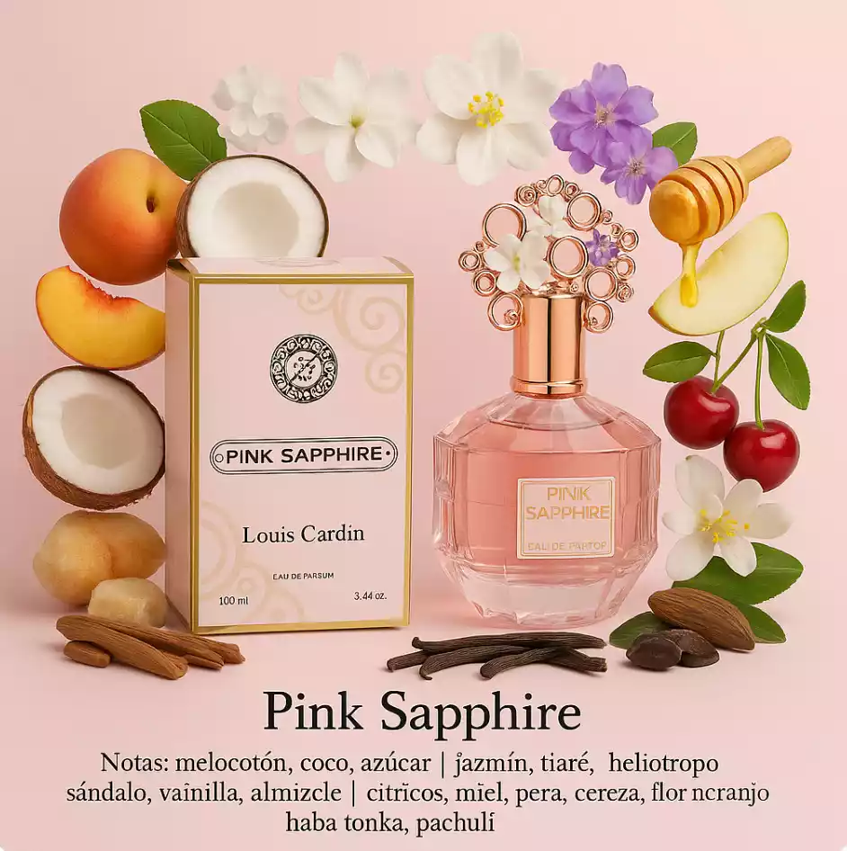 Pink Sapphire EDP abre con notas altas frescas de melocotón, coco y azúcar dando paso a notas medias de jazmín, tiaré, heliotropo y aterriza en notas base de sándalo, vainilla y almizcle. Una fragancia con notas superiores de cítricos y miel, notas de corazón de pera, cereza y flor de naranja, y una base de haba tonka, sándalo y pachulí. Abre con notas dulce-frutal con durazno y coco (un “sugar rush” elegante), evoluciona a un bouquet cremoso de jazmín, tiaré y heliotropo, y fija en una base cálida y envolvente de sándalo, vainilla y almizcle. Es un EDP pensado para clima cálido, uso diurno a vespertino, con estela moderada-notable y persistencia larga propia de su concentración. En lenguaje de ventas: “fresco, femenino, cremoso y adictivo”, con acabado piel-vainilla muy “likable”.
